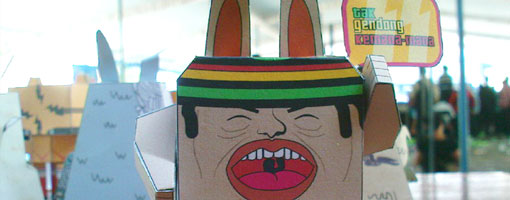 Papertoy tribute to Mbah Surip, designed by Dhendiawan Dwiatma. Mbah Surip (Grandpa Surip) is a street reggae musician, who passed away couple weeks ago. He inspired many of indonesian artist and fans for his humbleness, dedication and unussual songs he made. He passed away when he just reached his peak of popularity "Tak Gendong" (I'll carry you in the back ) is the favorite song.