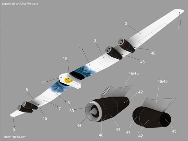 I must build this model, that's the first thought when I first saw this aircraft. So here it is, this paper model templates is ready for download and build. I made in 1/100 scale, the complete model will be 42.7 cm wingspan. Because it's relatively small it doesn't have shape formers, but like other airliner series it still use inner glue tabs. I designed the templates for easier build, so you won't find Dr. Zarkov's kind of model here.
