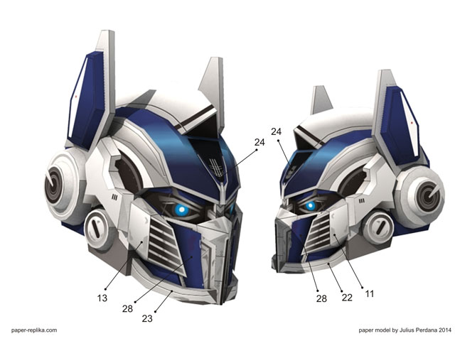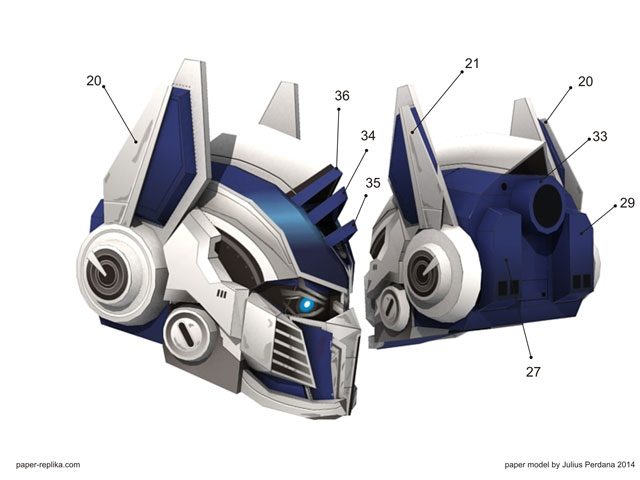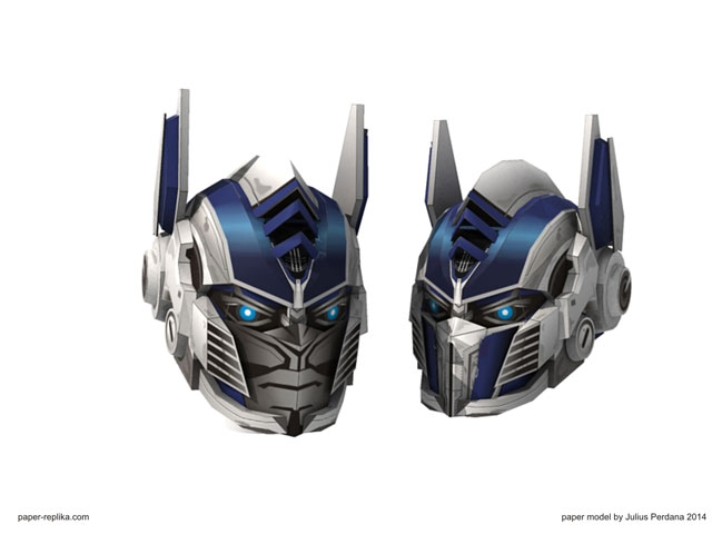 The new Optimus Prime in Transformers 4 movie is completely a different prime from the other sequels. Transformers 1-2 were with the same design, and then a bit different seen in Transformers 3, but the Prime in Transformers 4 looks kind of tribal and a lot cooler in my opinion. From the poll result in Paper Replika Facebook group they are many fans who loved to see the new Optimus Prime in papercraft. This time I would not make as complicated as the previous big Optimus, I will make it about half that size, about 70 cm in height. I also reduce the complexity from hard to medium, but I will still maintaining the detailed looks that Optimus Prime has. As usual this paper model series will be released part by part, I plan to finish all of it in about 2-3 months. The first part is this head. The head itself when completed will have about 8 cm in height. There will be blank template available soon.