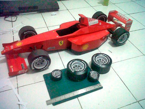 Due to many request to release these Formula one car templates so here they are, I finally have the time to prepare and share them. These templates were used for making an exhibition decoration props in early 2011, commissioned by an event organizer. The original template was prepared to be use on extended A3 paper size in order to build almost 1 meter length of paper model, but now I have re-size them to fit into A4 paper size. However the 3d model is not accurate, it was a quick modeling because of the deadline to met. All racing teams share the same Formula One car shape and only one template of tires. The teams are : Red Bull, Renault, Ferrari, BMW and McLaren. The real ones have tires different on front which smaller than the rear one, but I use only one size. As I recall I never made assembly instructions for this, so the best I can provide is a PDO file of what's left of it.