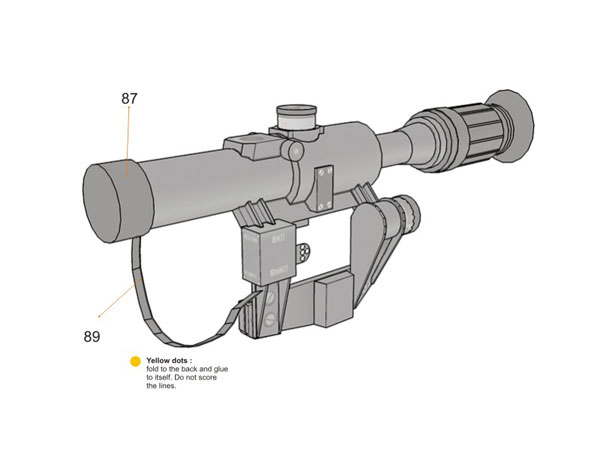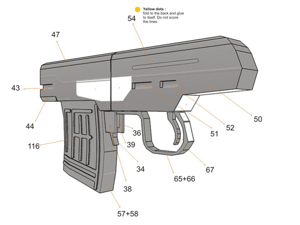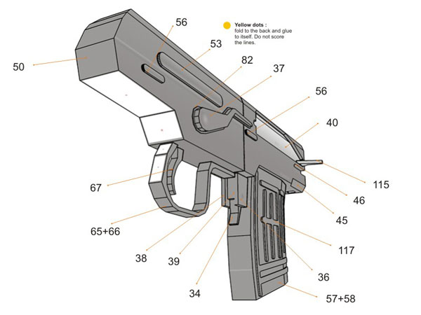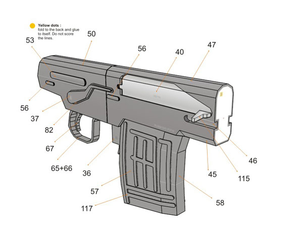 WARNING : It is made of paper and will not actually shoot, just for display purposes. Please be advised, it may built with paper but it surely look like a REAL weapon, please do not use it other than display purposes, such as carry it around on public places. You could have problems with authorities. You can disassemble it when transporting. On some countries possessing this kind of model is illegal, please be sure before making the model.