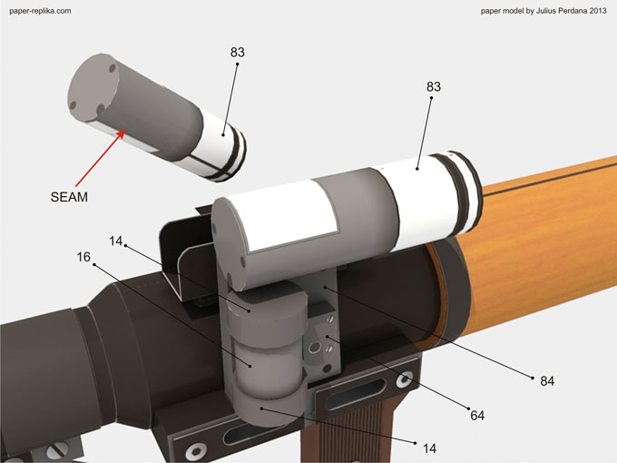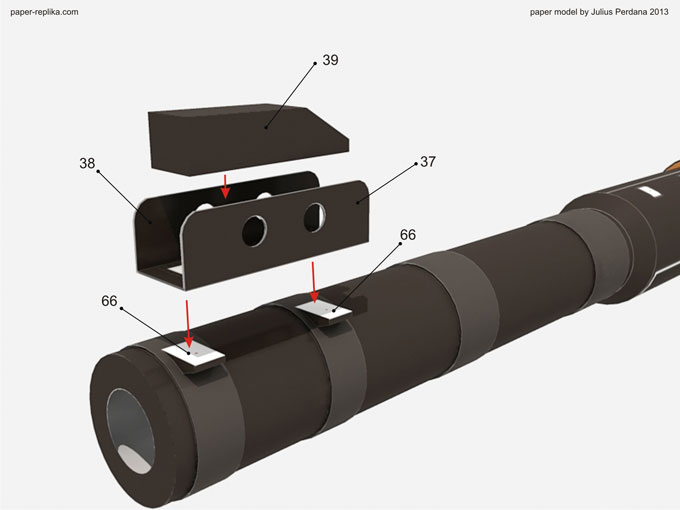 Assembly construction stick for the projectile warhead (77 and 79) using part 78 inside them. You can add additional rolls of paper inside it to add strength if you want to. Attach the stick with back part of the warhead (29,27 and 30)