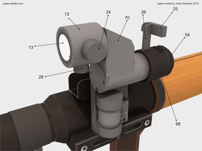 This model is a request from Paper Replika new Facebook group, Paper Replika Friends. On that group you can discuss about every model made by Paper Replika and also you can make suggestion or request of model that you like and want to be made as paper model pattern. Every request will still filter by me, and only approved requests will be made. This RPG-7 paper model template contains 30 pages of patterns. The scale is 1:1, so I also made its inner construction. The warhead can be detach but with simplified model. I recommend to use 200 gsm paper and thicker for its inner constructions. This Soviet portable unguided rocket missile is very popular heavy weapon among armed forces in many countries. Some countries copied its design or reproduce under license.