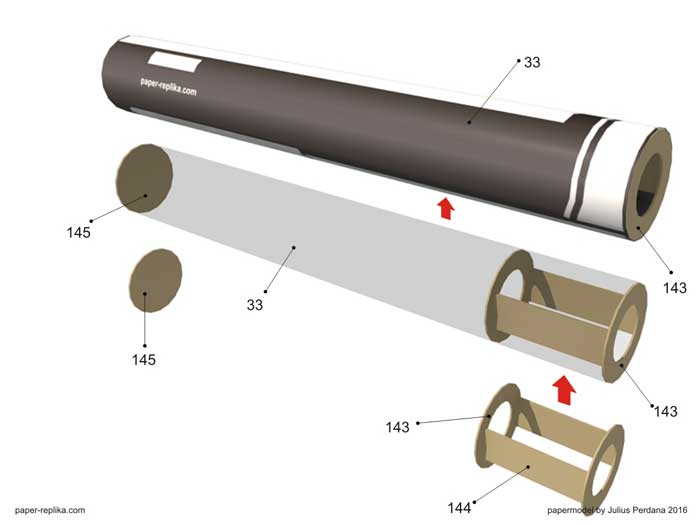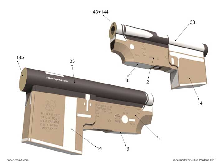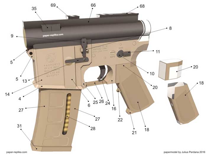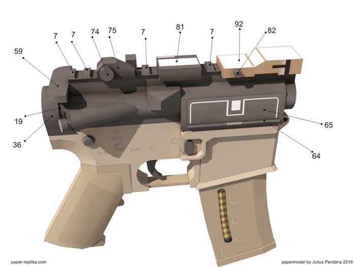 WARNING : It is made of paper and will not actually shoot, just for display purposes. Please be advised, it may built with paper but it surely look like a REAL weapon, please do not use it other than display purposes, such as carry it around on public places. You could have problems with authorities. You can disassemble it when transporting. On some countries possessing this kind of model is illegal, please be sure before making the model.